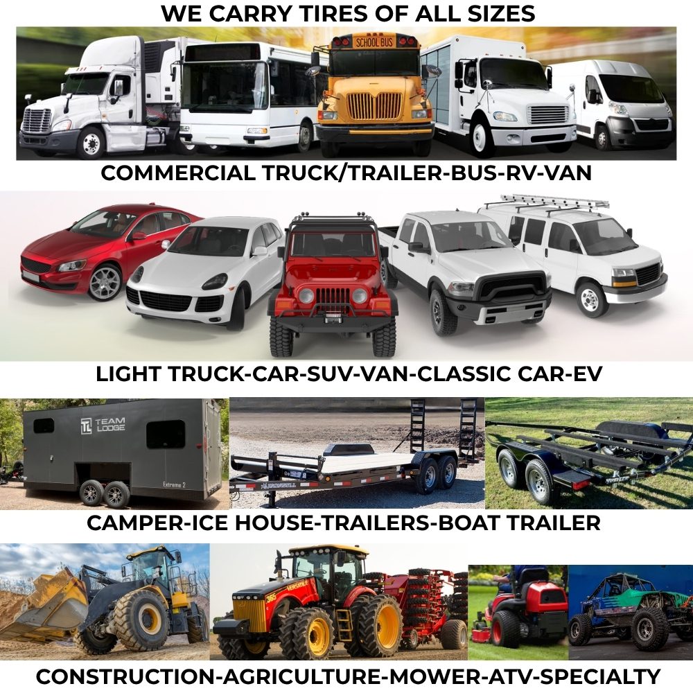 No matter what you drive or haul, we carry tires to match. From commercial trucks, trailers, buses, and RVs to vans, light trucks, cars, SUVs, and EVs, our team can get you set up with the right fit. We also stock options for campers, ice houses, boat trailers, construction and ag equipment, mowers, ATVs, and other specialty vehicles, so you are ready for work or the road ahead.